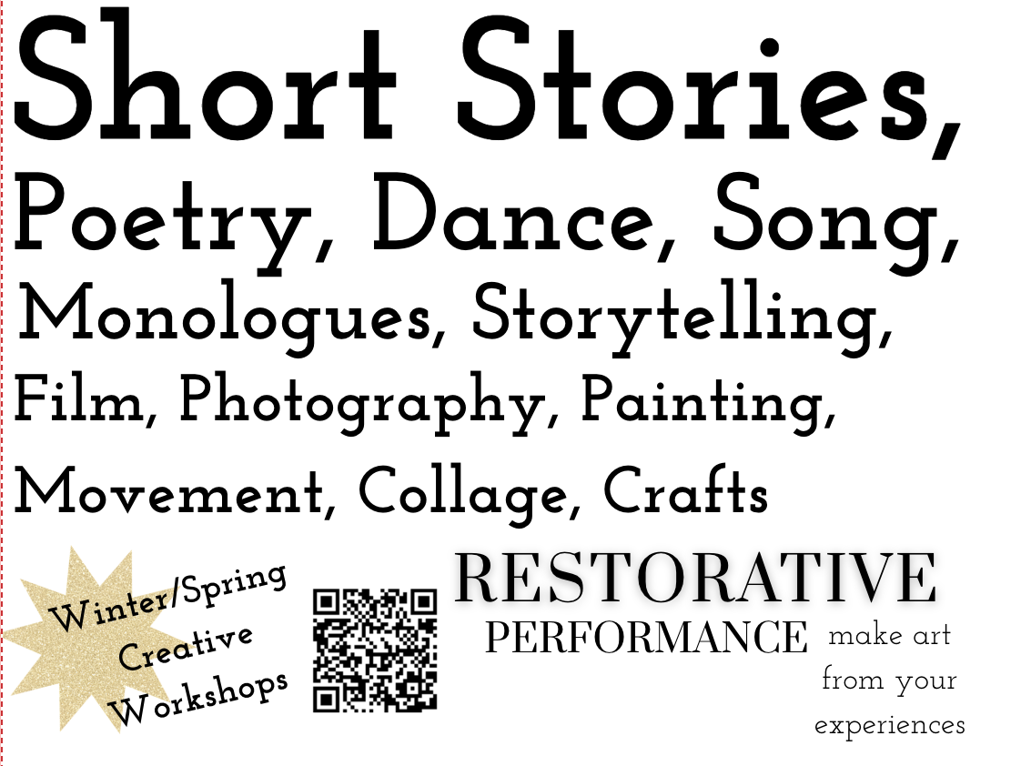 Therapeutic performance workshops such as RESTORATIVE PERFORMANCE where movement, music, drama and visual arts guide self exploration and give voice to our experiences
